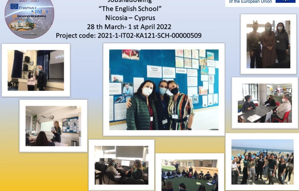 Dal 27 marzo al 2 aprile 2022 a Cipro la Coordinatrice del team Erasmus Savina Moniaci, assieme alla Coordinatrice del Dipartimento di Asse dei Linguaggi e Asse Storico Sociale del triennio Sandra Macrina, sono state impegnate in una proficua attività di jobshadowing nella prestigiosissima “English School” di Nicosia cipriota, diretta magistralmente da David Lambon, affiancando brillanti professionisti come Emily Papandreou, Shura Economou, Yiannis Georgiou, Areti Hadjigeorgiou, Emily Protopapa, Katerina Ralli, Maria Papagapiou e Anna Melis nelle loro lezioni e avviando confronti costruttivi in merito alle metodologie e ai sistemi di valutazione adottati.