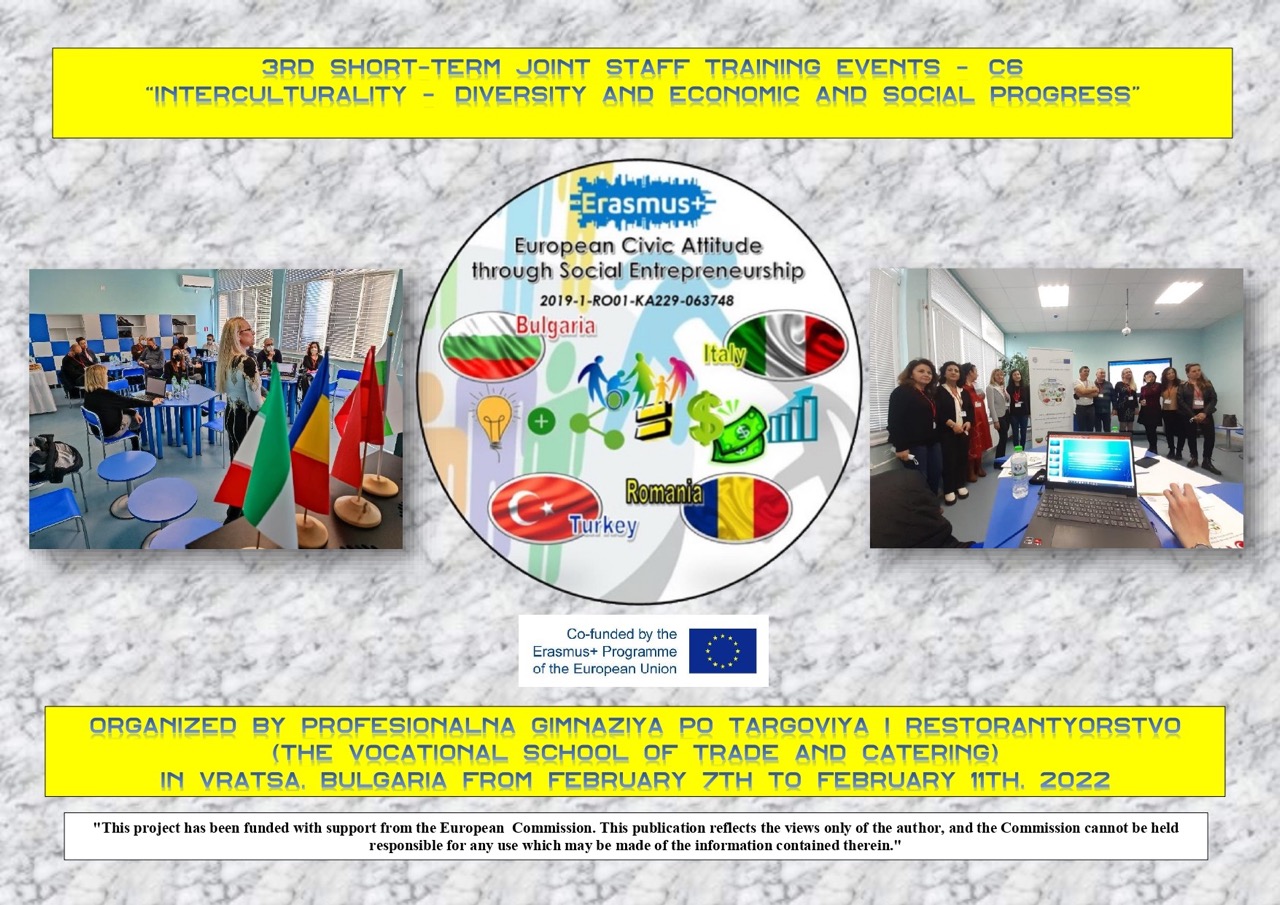 Tra il 6 e il 12 febbraio, grazie al progetto “European civic attitude through social entrepreneurship“, ospitato dalla scuola di Vratsa “The Vocational School of Trade and Catering”, una delegazione dell’Itt Malafarina, composta da 8 studenti e quattro professori, si è approcciata al mondo del business europeo. Nel corso del meeting, durato una settimana, la scuola bulgara ha organizzato seminari con professionisti del settore e workshop durante i quali ciascuna delle scuole partner italiane, bulgare, turche e rumene ha presentato quattro business plan di imprese virtuali a carattere sociale.