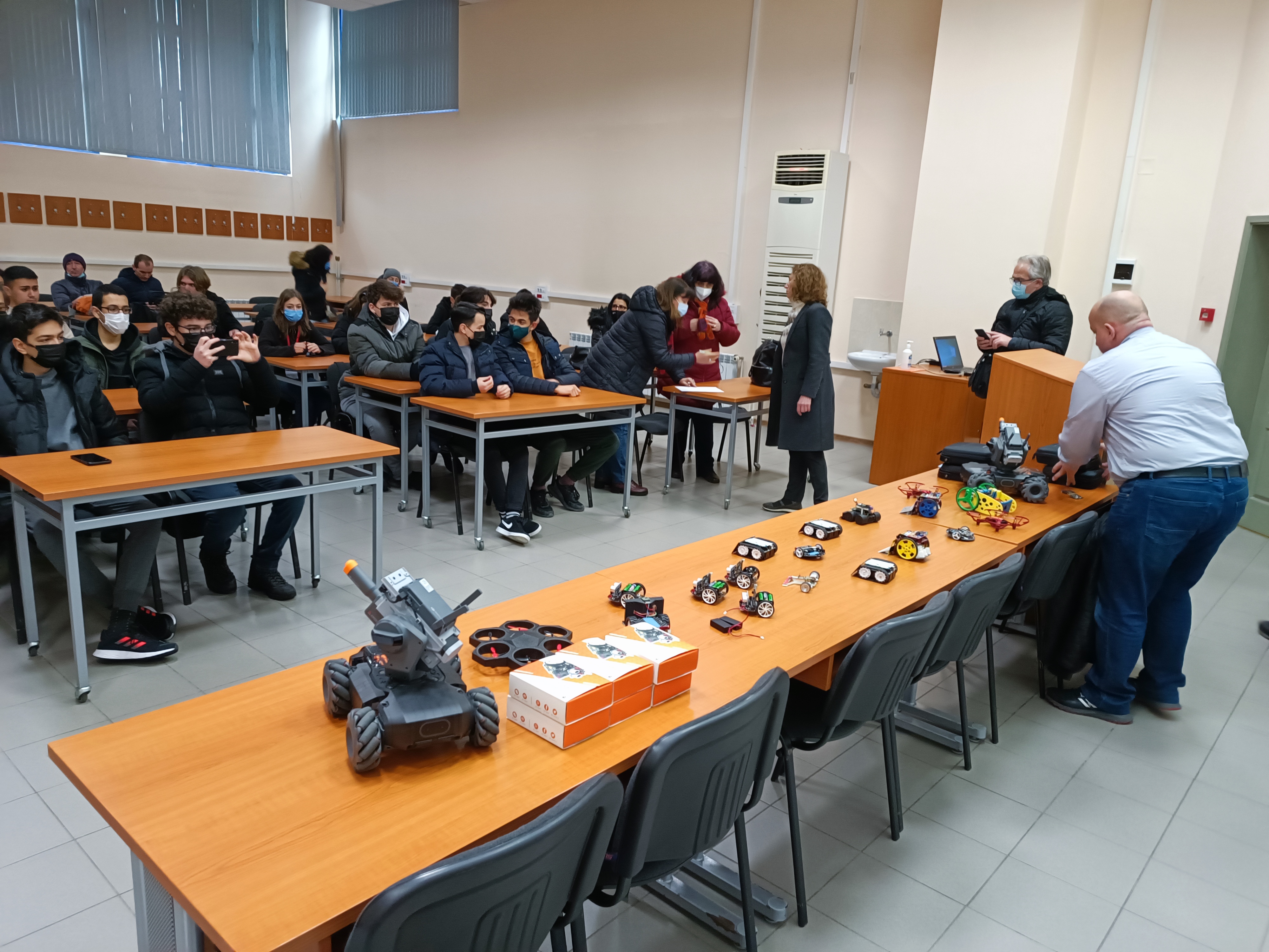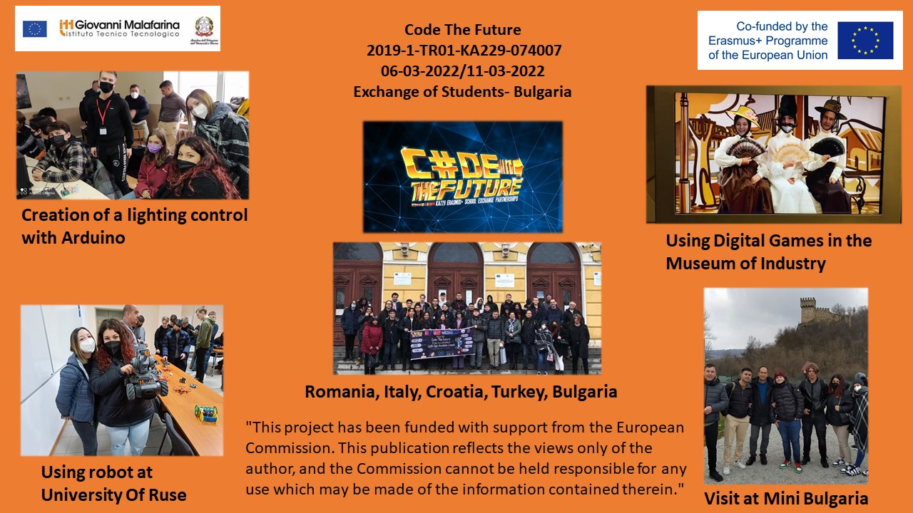L’Istituto Tecnico Tecnologico G. Malafarina, guidato dal Dirigente Domenico Agazio Servello, nell’ambito del progetto Erasmus+ “Code the Future”, ha inviato una delegazione formata da docenti, tecnici e studenti a Svishtov, Bulgaria dal 6 all’11 Marzo 2022, presso la Secondary School "Nikolay Katranov”. Argomento specifico del meeting è stato l’uso della piattaforma Arduino e delle metodologie STEAM. Gli studenti dell’Istituto soveratese, rappresentati da Debora Marascio, Vittoria Procopio, Sviatoslav Filonchuk, Francesco Masucci e Francesco Samà, guidati e coadiuvati dal Prof. Vincenzo Naso e dal Tecnico Giuseppe Schiavi, hanno presentato un progetto ideato dall’Ing. Franco Babbo e dal suo agguerrito team di studenti informatici riguardante la generazione di forme d’onda di diverse frequenze atte a simulare il sintetizzatore musicale Moog. In modalità online, in collegamento diretto con i laboratori del Malafarina, è stato anche presentato un prototipo di braccio domotico realizzato con componenti Lego, gestito e comandato a distanza da due schede Arduino. Inoltre il team dell’ingegnere Babbo ha illustrato una mini base di controllo del movimento di un braccio robotico dotata di ricevitore radio, led e display realizzati sempre con Arduino, un nastro trasportatore ed un mini-rover Lego interattivi. L’attento coordinamento del team ospite non poteva lasciarsi sfuggire l’opportunità di offrire un’interessante lezione dello stato dell’arte della scienza della robotica bulgara presso il Dipartimento dell’Università “Angel Kanchev” di Ruse. Il dinamico e comunicativo Dr. Plamen Zahariev, docente dello stesso ateneo, ha fornito un’ampia panoramica delle piattaforme e dei linguaggi di programmazione usati nella moderna didattica per poi coinvolgere gli studenti in attività pratiche e dimostrative con l’uso di piccoli robot e droni.
