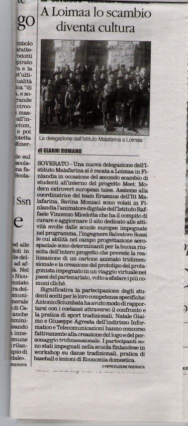 Una nuova delegazione si è già recata a Loimaa in Finlandia dal 12 al 18 marzo in occasione del secondo scambio di studenti all’interno del progetto Meet: Modern Extrovert European Tales. La modernissima scuola Puistokadun koulu ha incantato i partner provenienti anche da Francia, Turchia e Grecia ed il confronto si è subito aperto sulle caratteristiche che rendono il sistema scolastico finlandese tra i più efficaci a livello mondiale. Assieme alla coordinatrice del Team Erasmus dell’Itt Malafarina, prof.ssa Savina Moniaci sono volati in Finlandia l’Animatore Digitale dell’Istituto prof. Raffaele Vincenzo Micelotta che ha l’onere di curare e aggiornare sul sito dedicato del progetto le svariate attività svolte dalle scuole europee impegnate nel programma, l’Ingegnere Salvatore Sozzi le cui abilità nel campo progettazione aerospaziale sono determinanti per la buona riuscita dell’intero progetto che prevede la realizzazione di un cartone animato tridimensionale e la creazione del prototipo del protagonista impegnato in un viaggio virtuale nei paesi del partenariato, volto a sfatare i più comuni clichè. Significativa la partecipazione degli studenti che sono stati scelti per le loro competenze specifiche: Antonio Sciumbata ha avuto modo di rapportarsi ai coetanei attraverso il confronto e la pratica di sport tradizionali, Natale Giaimo e Giuseppe Agresta dell’indirizzo Informatico e Telecomunicazioni hanno concorso fattivamente alla creazione del logo e del personaggio tridimensionale, dotato di caratteristiche fisiche e morali tipiche delle popolazioni dei paesi partner. I partecipanti sono stati impegnati nella scuola finlandese in workshop su danze tradizionali, pratica di baseball e lezioni di Economia Domestica. Presso la facoltà di Dipartimento di Progettazione e Arti Applicate dell’Università di Turku si sono cimentati in realizzazioni pittoriche di autoritratti e negli Studios di Animazione Digitale della facoltà di Scienze e Tecnologie Applicate di Torku in creazioni di personaggi tridimensionali. Oltre alla visita guidata al Museo Taidetalo di Loimaa, al centro Culturale Espoo di Logomo hanno potuto, direttamente, interagire con Mikko Paakkola, noto esponente della pittura modernista scandinava e al Museo delle Arti dell’antica capitale finlandese hanno avuto modo di ammirare le opere di Elina Brotherus. L’interessantissima immersione culturale si è conclusa con la visita al Museo delle Arti Emma, al Centro Eureka e al Planetarium di Helsinki.