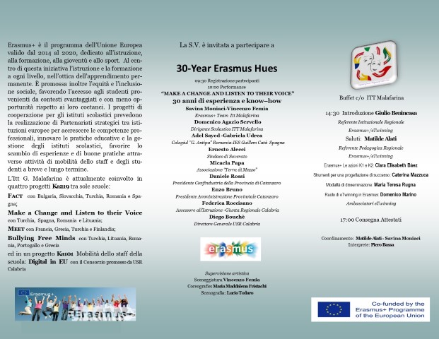 La prof.ssa Moniaci ha proposto l’evento “30-Year Erasmus Hues" Erasmus all’interno della mobilitità in entrata di Make a Change and Listen to their Voice assieme a partner lituani, turchi, spagnoli e rumeni le cui delegazioni coordinate rispettivamente da Mrs Gabriela Udrea, Mr Gokhan Gökce, Mr Adel Sayed e Mrs Rasa Rimidytė- Liekienė hanno presenziato all’evento. Il primo marzo presso il Teatro Comunale di Soverato si è svolta una giornata dedicata ai 30 anni di esperienza e know-how del programma dell’Unione Europea rivolto all'istruzione, alla formazione, alla gioventù e allo sport . La coordinatrice del team Erasmus plus dell’Istituto Tecnologico G. Malafarina, prof.ssa Savina Moniaci, in collaborazione con l’’Ufficio Scolastico Regionale nelle persone dei referenti istituzionali e pedagogici dei programmi Erasmus e/Twinning, dottor Giulio Benincasa e prof.ssa Matilde Alati ha organizzato un happening sia di carattere divulgativo che formativo, invitanto i Dirigenti e i referenti del programma di tutte le scuole della Calabria con il patrocinio delle amministrazioni Comunale, Provinciale, Regionale, di Confindustria, delle associazioni culturali “Terra di Mezzo” ,“La Calabria che rema” “Education & Training” e soprattutto delle Unità nazionali di eTwinning, Indire, Inapp e Agenzia Giovani.