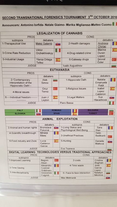 Le attività della mobilità tenutasi a Soverato dal 3 al 7 ottobre che ha coinvolto delegazioni provenienti da Bulgaria, Spagna, Turchia, Romania e Slovacchia (26 studenti e 12 docenti stranieri) sono state incentrate sul confronto culturale attuato tramite la tematica specifica del turismo nelle sue varie tipologie: ricreativo, eno-gastronomico, storico/socio-culturale, montano, marino, lacustre, religioso, ecologico, interculturale, congressuale, artigianale, folcloristico attraverso la partecipazione a visite guidate al Castello di Scilla, al Monte Sant’Elia, al fiume Metauro, al Museo, alla Chiesa ortodossa e alla Basilica di Seminara, all’anfiteatro e ai Giardini Naxos di Taormina, alla partecipazione al Tropea Festival: Leggere e Scrivere. Le competizioni si sono svolte attraverso la conduzione di 5 dibattiti internazionali su argomenti attualissimi quali l’immigrazione, la  legalizzazione della cannabis, l’eutanasia, lo sfruttamento degli animali e l’introduzione degli strumenti digitali nella didattica.