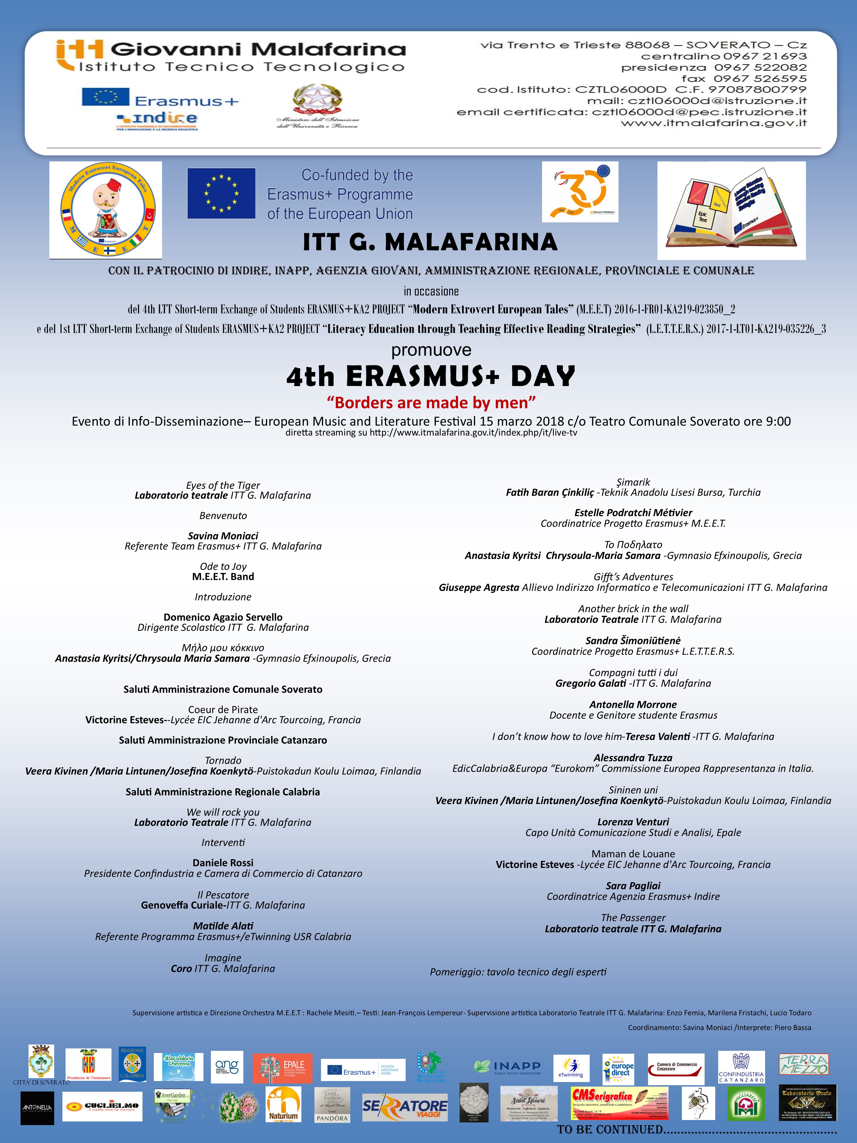 In occasione della mobilità in entrata del Progetto Meet dal 12 al 16 marzo 2018, l’Istituto ha programmato un Erasmus+ Day: “Borders are made by men” -Evento di Info-Disseminazione: European Music Festival, sotto il patrocinio dell’Ufficio Scolastico Regionale, dell’Amministrazione Comunale, Provinciale, Regionale, della Confindustria, della Camera di Commercio, delle associazioni culturali “Terra di Mezzo” e “La Calabria che rema” e delle sedi nazionali di Indire, Inapp, Agenzia Giovani ed eTwinning.