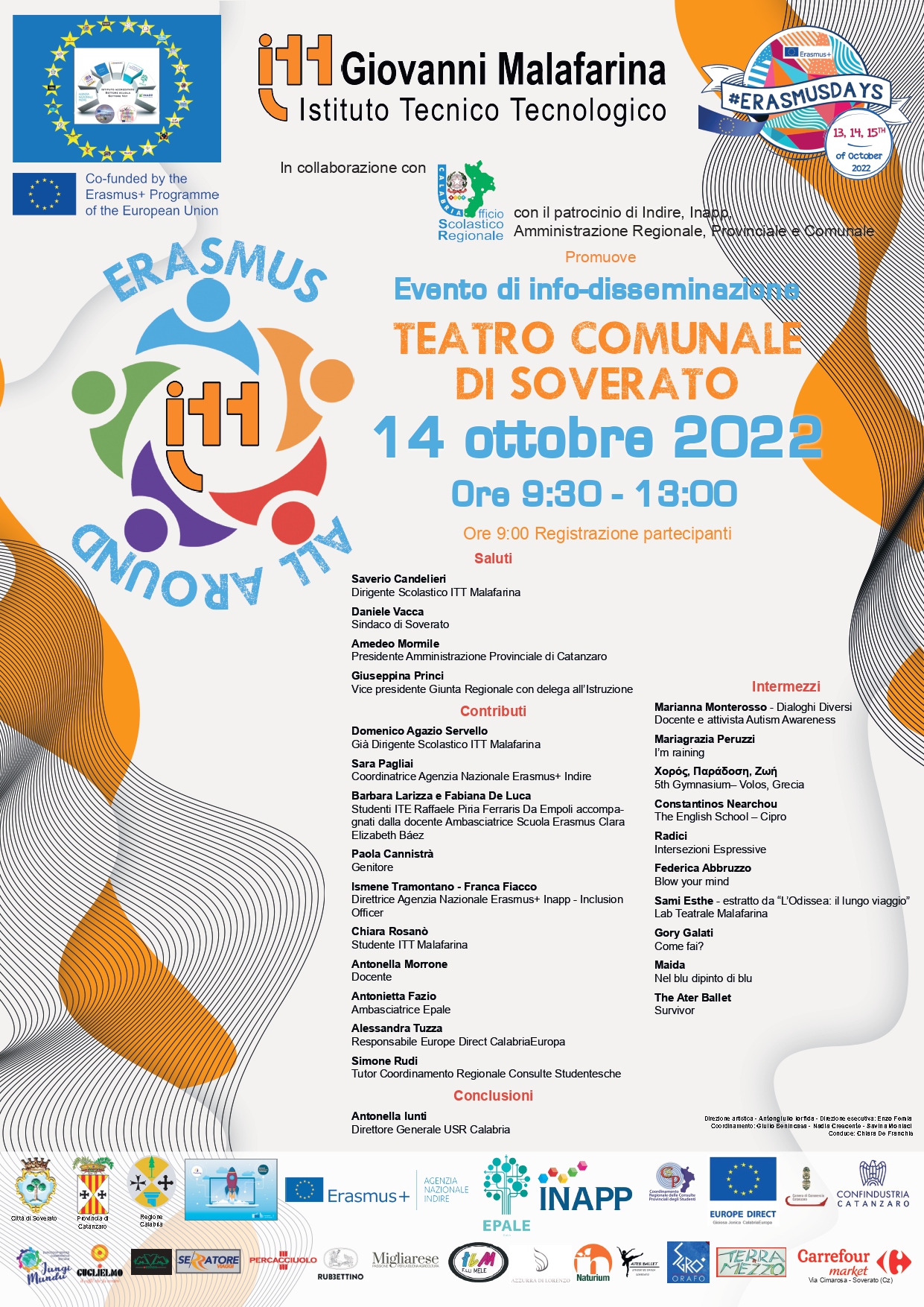 Si svolgerà a Soverato il prossimo 14 Ottobre l’evento ERASMUS+ Info/Dissemination Day: Erasmus All Around. A darne notizia Il Dirigente scolastico Saverio Candelieri e lo staff Erasmus+ coordinato dalla prof.ssa Savina Moniaci dell’ITT “G. Malafarina”, istituto che ospiterà l’iniziativa resa possibile grazie alla collaborazione di Giulio Benincasa e Nadia Crescente, rispettivamente Referenti istituzionale e pedagogico del Programma Erasmus+ dell’Ufficio Scolastico Regionale per la Calabria.