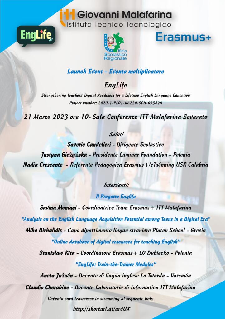 Ad una settimana dal rientro dall’Irlanda della delegazione italiana dello staff Erasmus+ del Malafarina, coordinato dalla prof.ssa Savina Moniaci, che ha visto una selezione di studenti dell’Istituto impegnati in team internazionali provenienti da Polonia, Grecia e Serbia in workshop digitali diretti dal professor Claudio Cherubino, l’Istituto soveratese si prepara ad accogliere, in collaborazione con l’Ufficio Scolastico Regionale, il 21 marzo i partner di Englife per l’evento moltiplicatore di questo progetto innovativo coordinato dalla Luminar Foundation polacca.