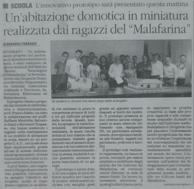 Generale Pubblicato: 06 Giugno 2018 Visite: 2845 Stampa Condividi Facebook Twitter Whatsapp Telegram Email Progetto prototipo di casa domotica NotizieAlunniDocenti
